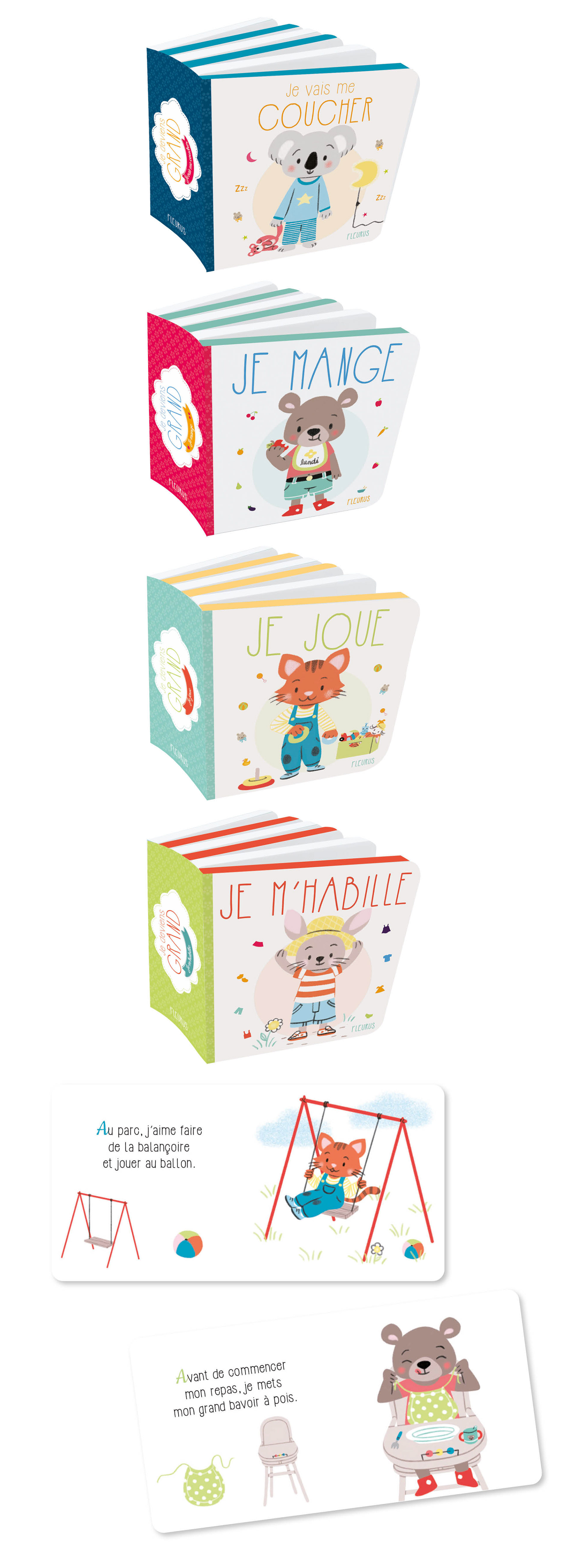 Direction artistique de la collection "Je vais me coucher", Fleurus. Conception graphique de la couverture, choix et suivi d'illustrateur, création de la maquette intérieure.