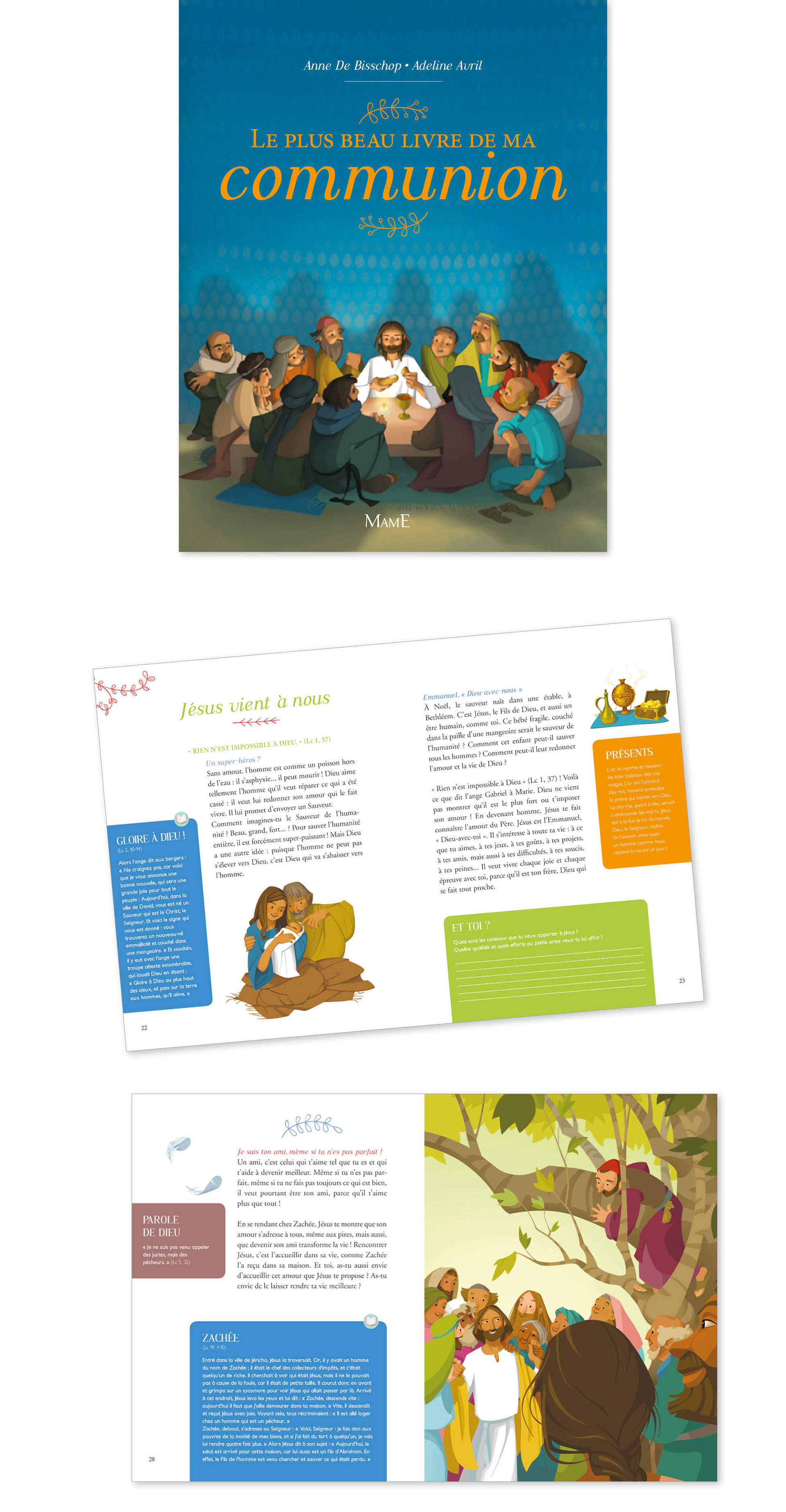 Direction artistique du livre "Le plus beau livre de ma communion", Mame. Conception graphique de la couverture, choix et suivi d'illustrateur, création de la maquette intérieure.