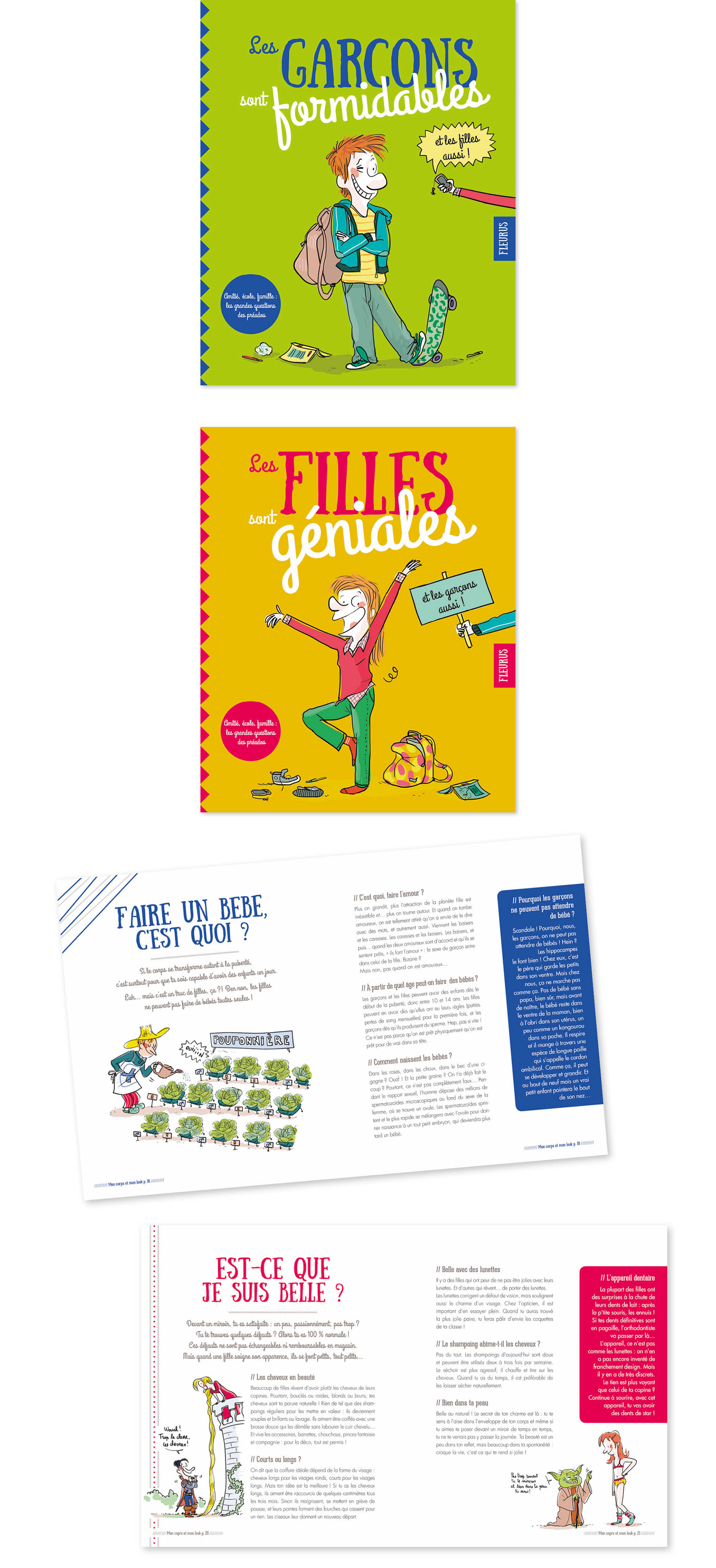 Direction artistique pour la refonte des livres "Les garçons sont formidables", "Les filles sont géniales", Fleurus. Conception graphique de la couverture, choix et suivi d'illustratrice, création d'un principe de maquette intérieure)
