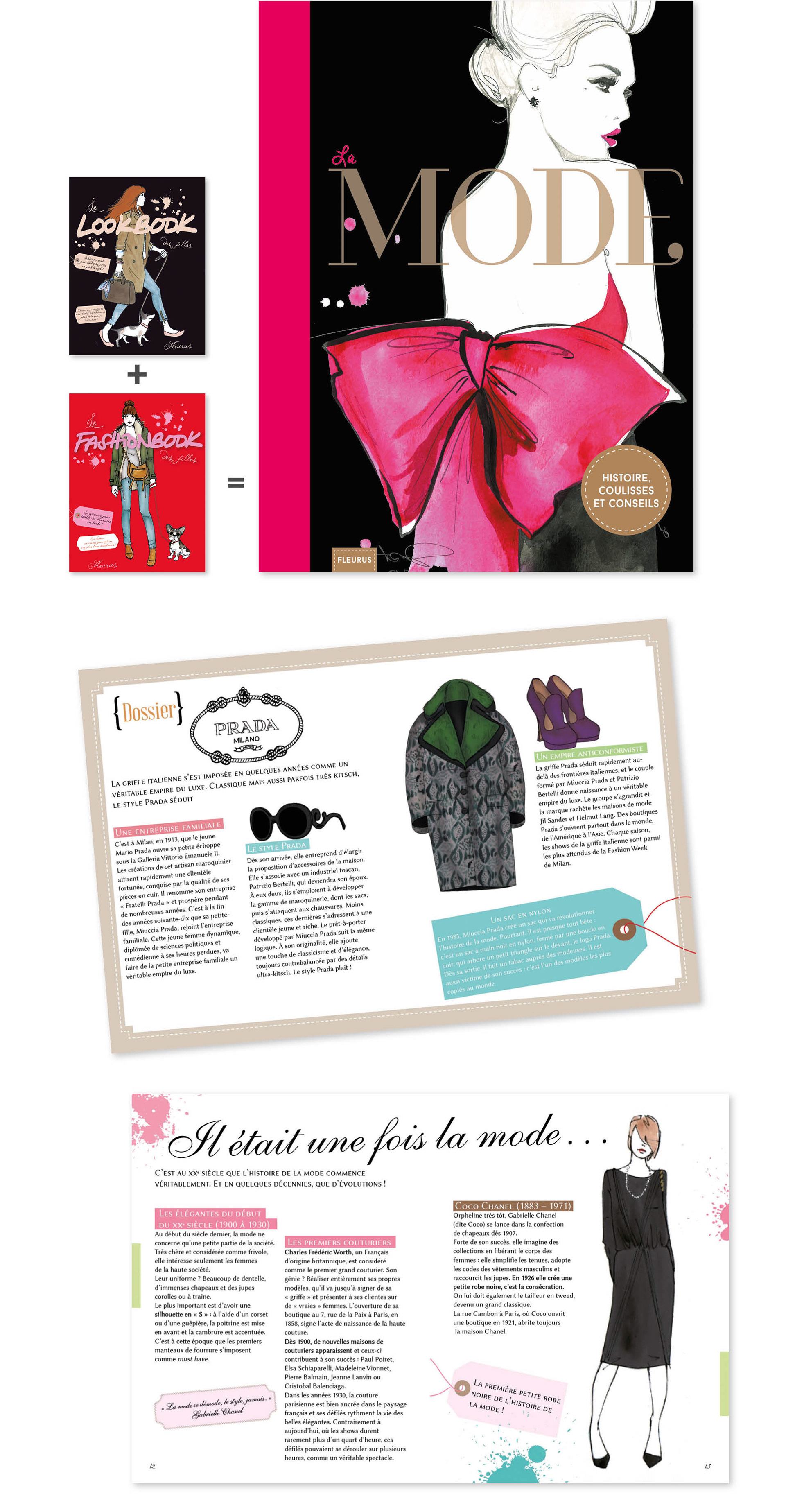 Direction artistique (conception graphique de la couverture, adaptation de la maquette intérieure pour certaines pages) du livre documentaire "La mode" (compilation de deux livres existants), Fleurus.