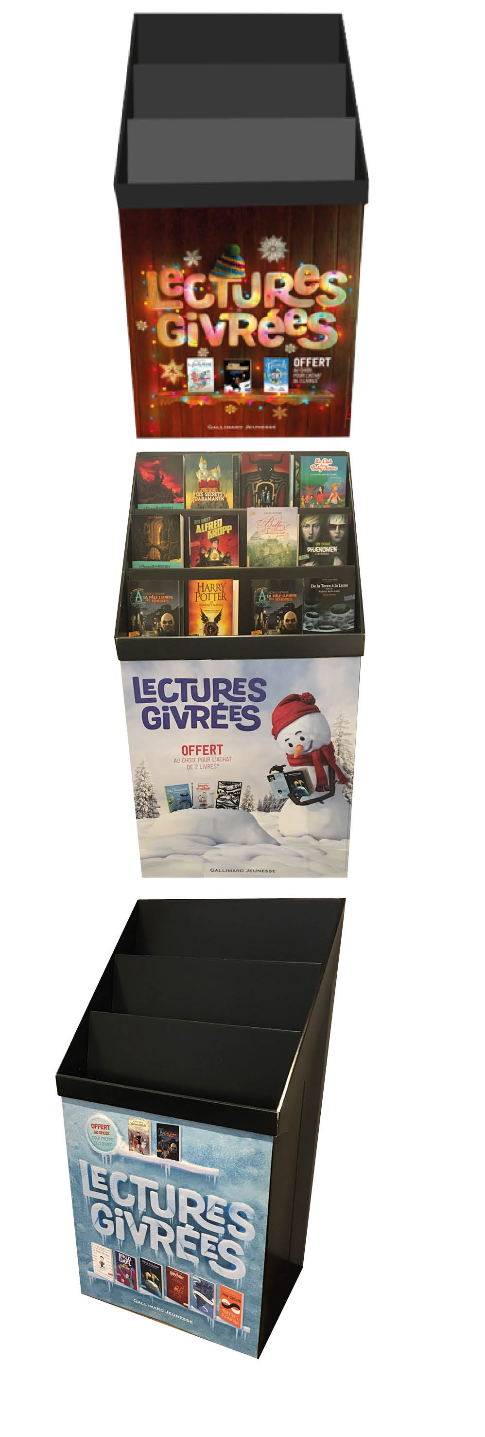 PLV "Lectures Givrées". Années 2018, 2020, 2021. Opération commerciale : un livre acheté = un livre offert.