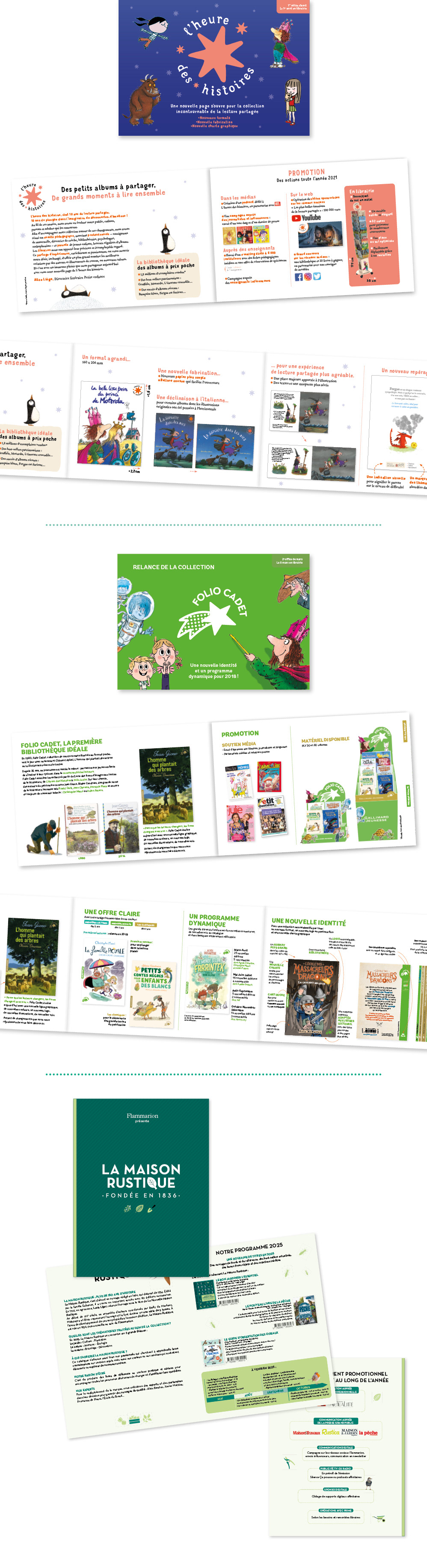 Plaquettes portefeuille de 6 pages pour les collections "l'heure des histoires" et "Folio Cadet".