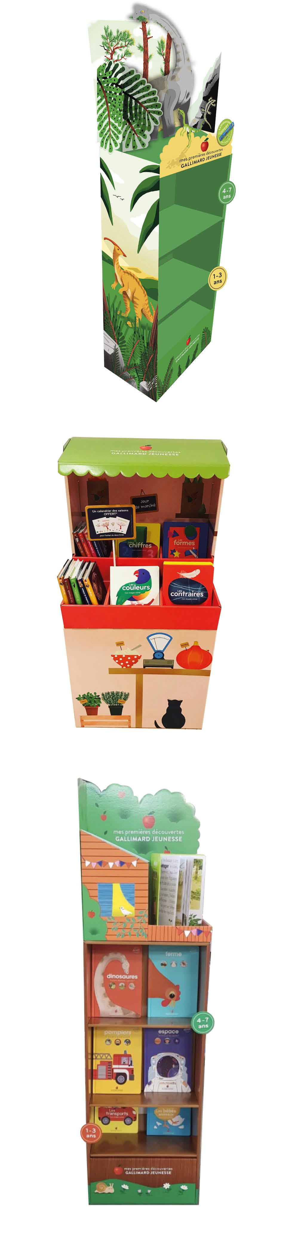 Conception graphique de PLV pour la collection "Mes premières découvertes". Années 2021, 2019, 2020. Travail sur l'objet, choix et suivi d'illustrateurs, exécution.