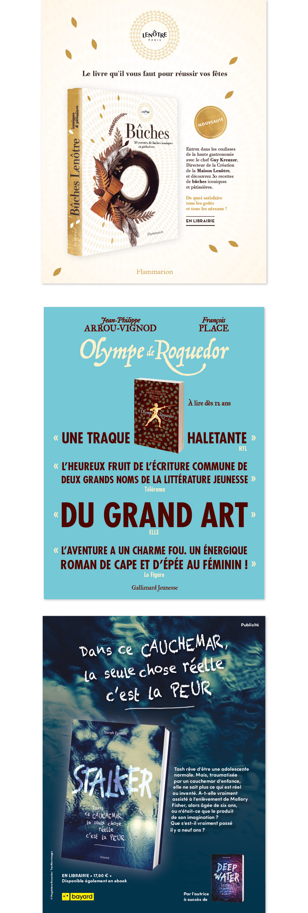 Publicités pour les livres "Bûches", Flammarion, "Olympe de Roquedor", Gallimard Jeunesse, et "Stalker", Bayard.